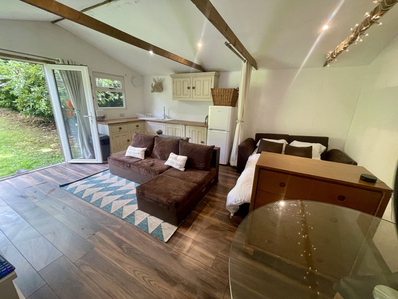 Garden house is at the end of 100ft garden. This will involve a walk up the garden to the main house to shower, toilet and use laundry. Its a bit like glamping!