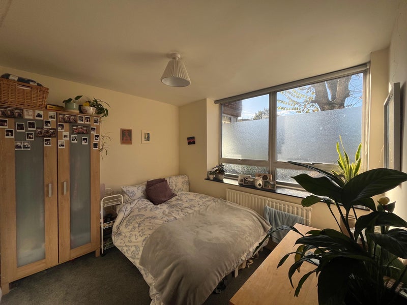 A sunny room with a small-double bed in a spacious, newly redecorated and newly carpeted three-bedroom ground-floor apartment in the peaceful heart of Hove, close to the beach, Hove station, Sussex Cricket Grounds, and Palmeira Square.