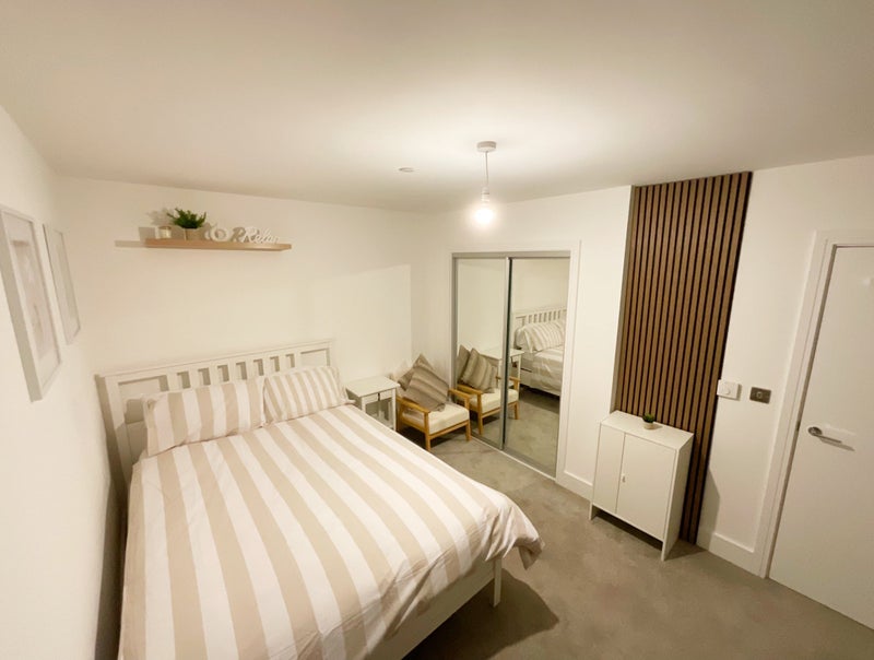 •Spacious double room with a double bed, large wardrobe, wall panels, and wall-mounted TV