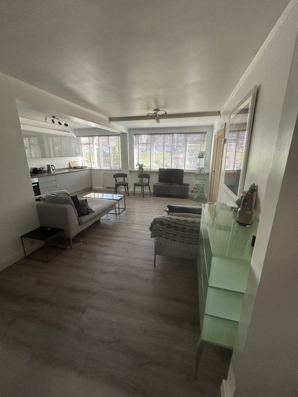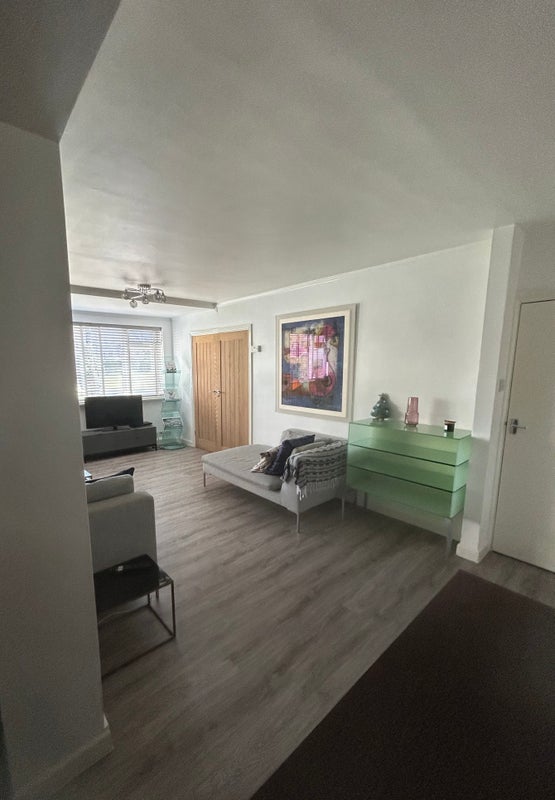 The living space is filled with natural light from large windows and offers a comfortable space. The property features a modern, stylish kitchen with plenty of storage.