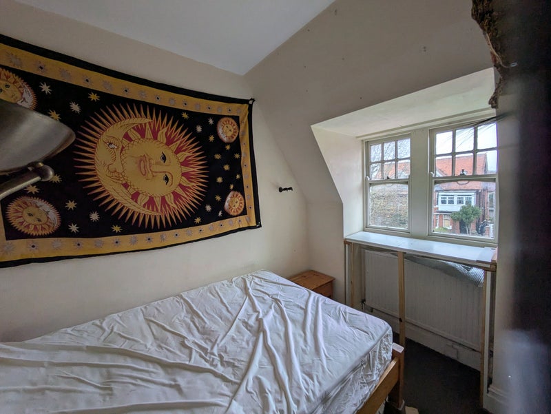 The room itself is very cozy. The reason it's probably one of the cheapest in Brighton & Hove is because the 3 bed apartment was made into a 4 bed, so the fixed rent was divisible by 4 instead of 3. The room is somewhat small but I have raised the bed by 2 feet to create loads of space underneath for storage.