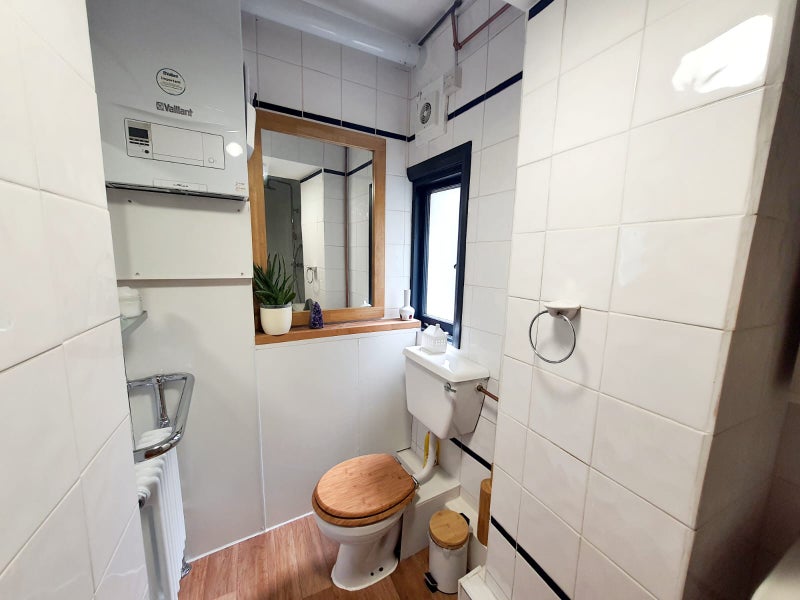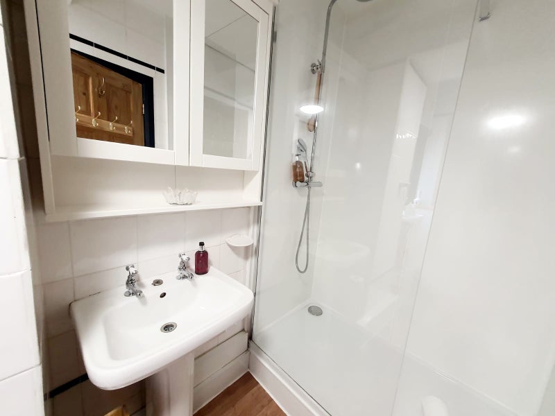 The flat has a fully equipped kitchen and a modern bathroom with shower.