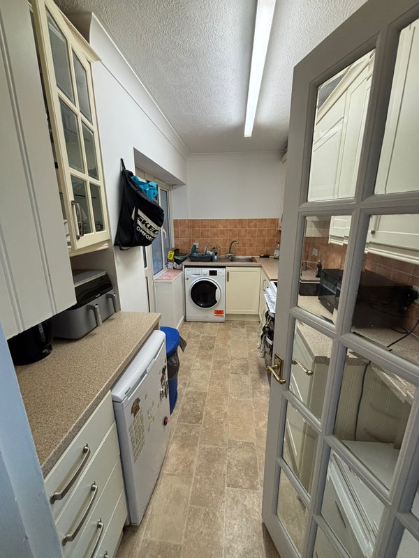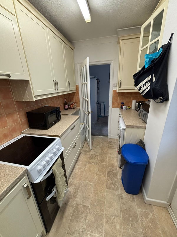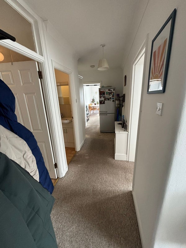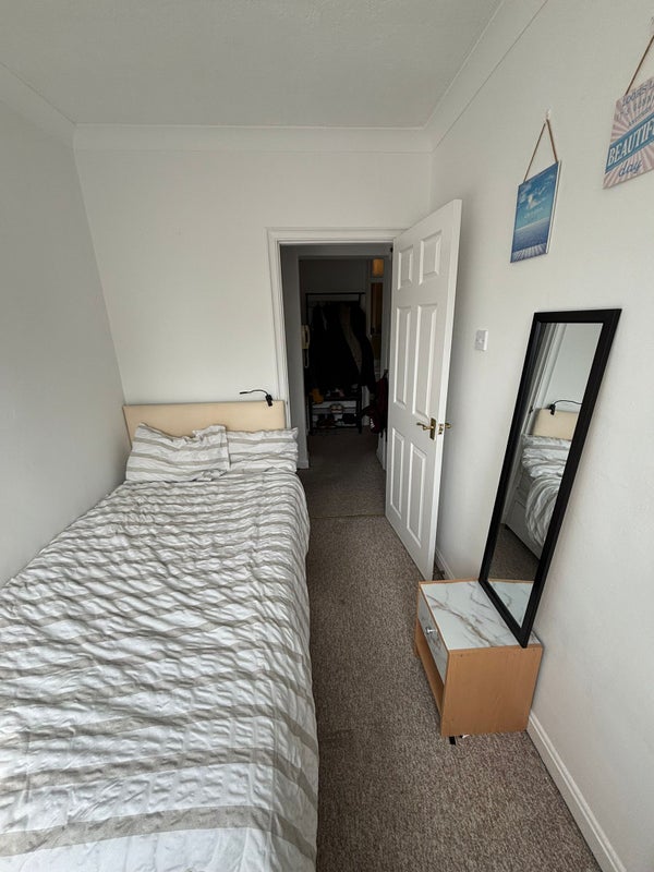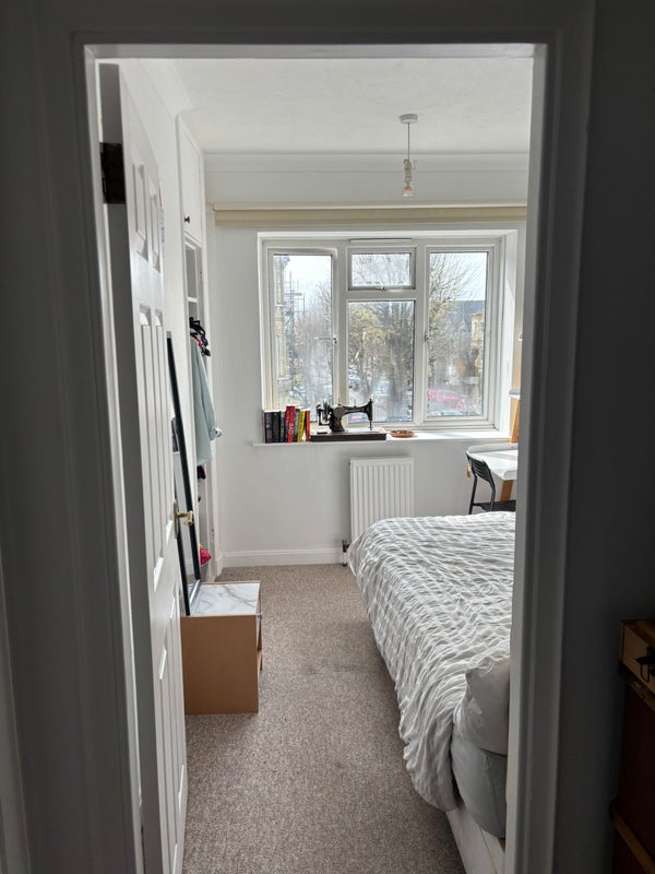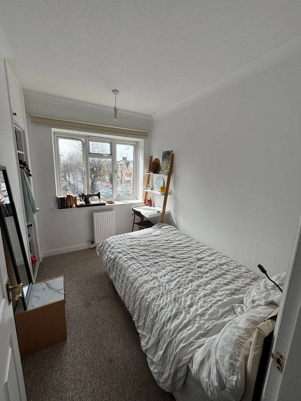 The flat is kept clean and tidy, and the room itself is bright with a large single bed and a small desk — great for studying or winding down after work.