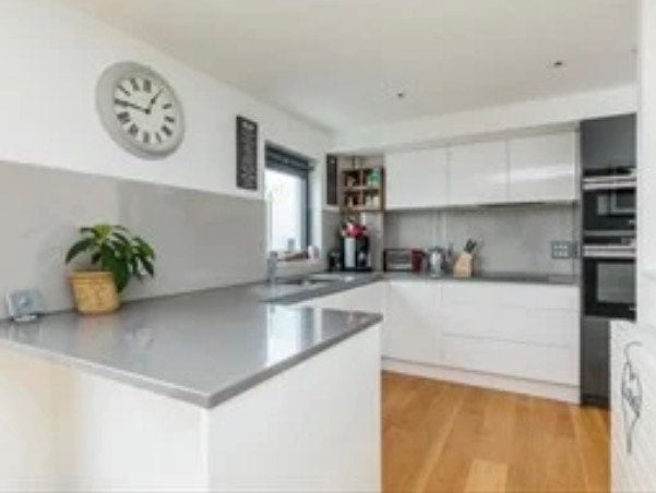 The contemporary fitted kitchen offers ample worktop and storage space, complemented by a double-aspect layout and an abundance of floor-to-ceiling glazing, creating a bright and airy feel throughout.