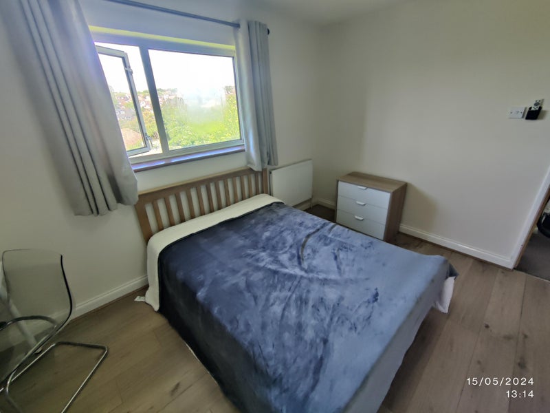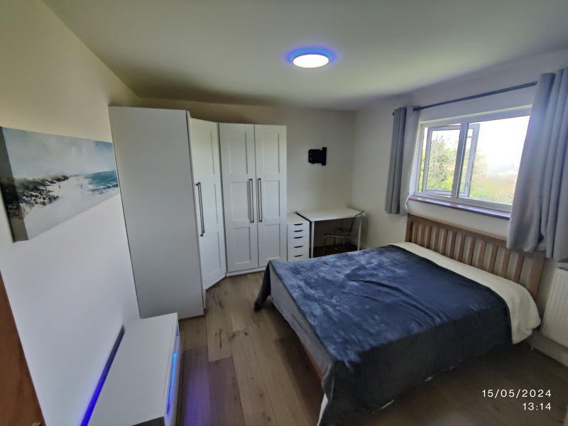 The room has a double bed, fitted wardrobes, chests of drawers and desk & chair.