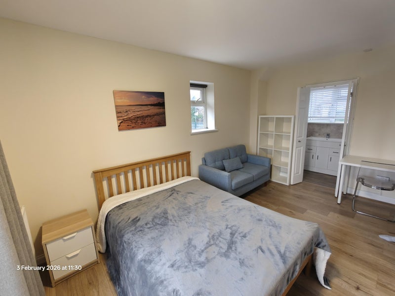 Room 5 is a huge room on the first floor and runs from the front to the back of the property. It has a balcony at the back, looking over the garden and with views out across Hangleton Valley to the downs, It has a double bed, wardrobes, chests of drawers, sofa and desk & chair. The ensuite has a thermostatic shower, toilet and basin.