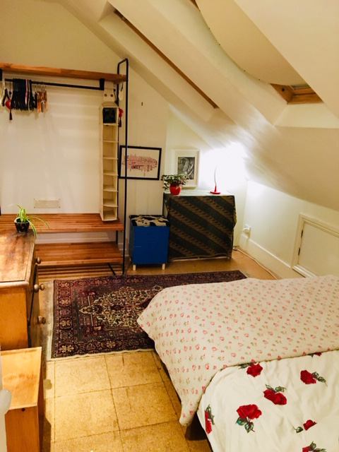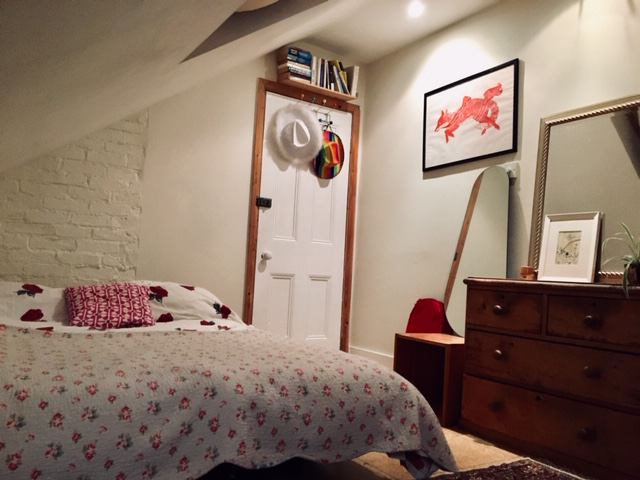 The room is on the top floor with two velux windows with garden and sea views, a double bed, chest of drawers and hanging space – quiet and cosy.