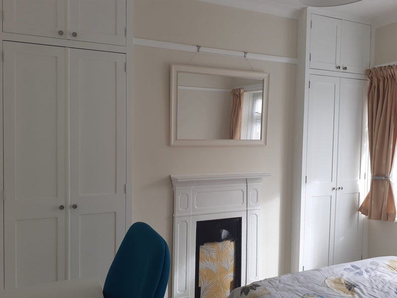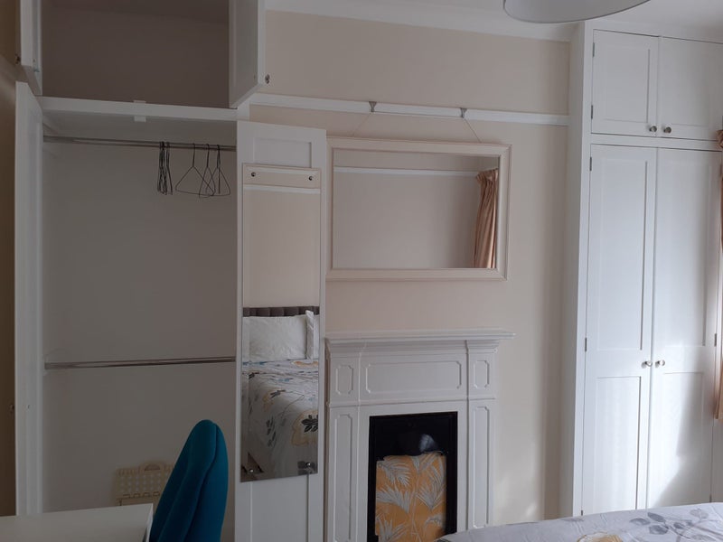 The room is fresh, clean and comfortable, with a lovely fireplace and plenty of storage. The desk is W75 x D50cm and has a drawer. There's a fitted wardrobe (two rails), fitted cupboards, drawers, bookshelf, under-bed storage and hooks on the back of the door, useful for hoodies, jackets, scarves and bags.
