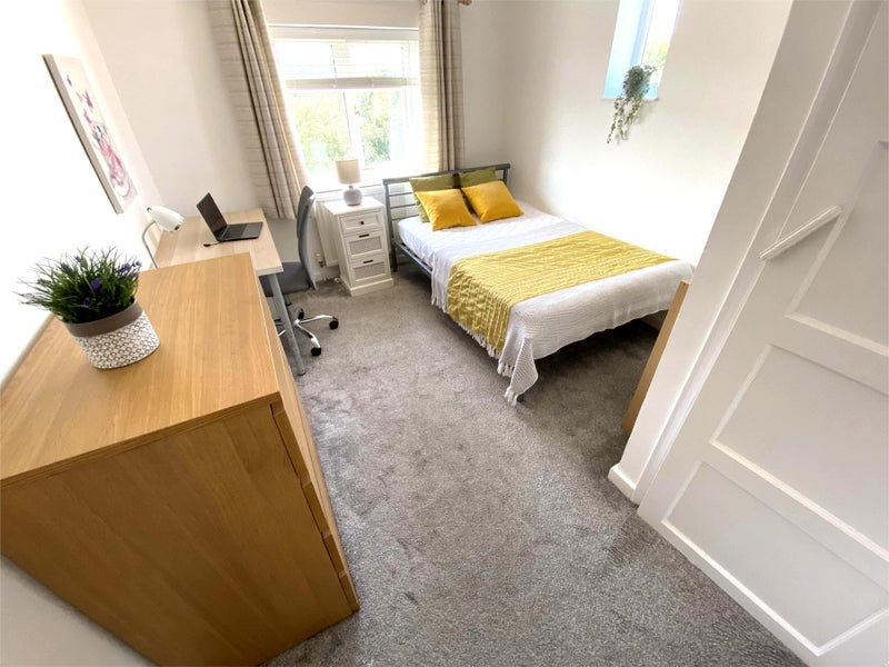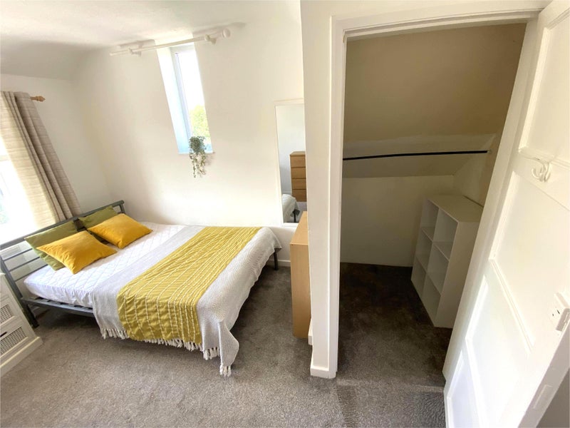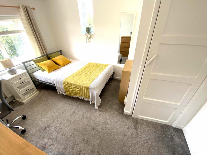 THIS ROOM has 2 windows, a large built in wardrobe, 4ft double bed, desk with drawers & chair on wheels, large chest of drawers, long wall mirror, bedside cabinet, lamp, bin, small bookcase, venetian wooden blinds with curtains.