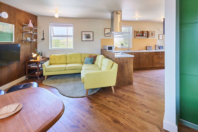 Inside, the property features an open-plan living, dining, and kitchen area designed for socialising and relaxation. The property features one beautifully styled double bedroom, offering a calm and cosy retreat. Finished in deep green tones with contemporary wall lights and minimalist floating bedside tables, the space balances character with comfort. Plenty of natural light and a peaceful view of the quiet street below.