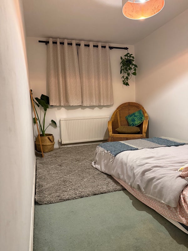 A room available in a well-kept flat. The room comes part furnished (can remove items if you have your own).You’ll be sharing with just me – a single professional woman – and my cat. The flat is clean and relaxed and covered in plants. A private parking space is included. I’m looking for someone who is clean and respectful. Ideally someone easy-going who treats the flat like a home rather than just a place to sleep.