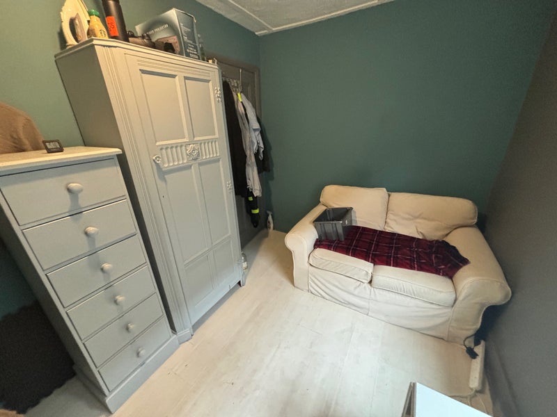 The room comes with a double bed, wardrobe, chest of drawers, comfy sofa, fold out table and chairs that can be used for a dining table or double up as a desk.