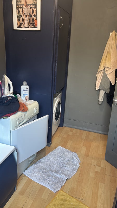 Bathroom has a electric shower over bath, and there is a washing machine and a tumble dryer.