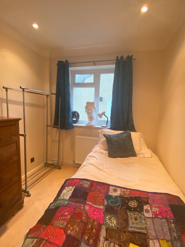 Small light single room on short let 3-6 months by agreement. The accommodation comprises a comfortable single bed, a lamp, a Victorian cherrywood chest of drawers, a metal clothes hanging rail with hangers. Your own small fridge and a Miele freezer in the porch.