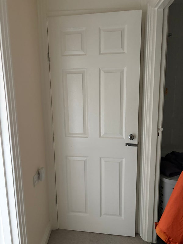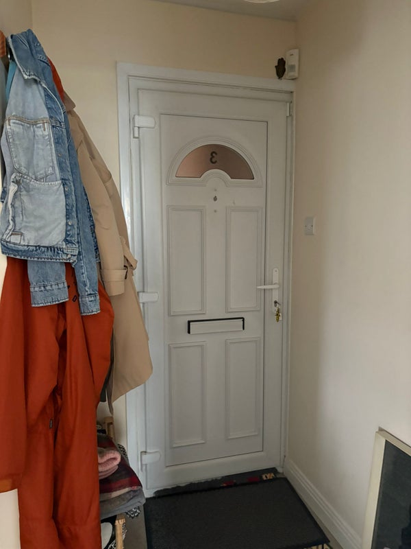 Front door leads to hallway with storage cupboard and bathroom with window onto stairwell of block