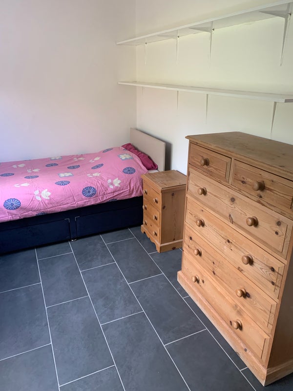 It's a double room for rent, recently decorated with a new bed, ( hence looks a little sterile in pics) wardrobe, large chest of draws, bedside draws with bedside lamp