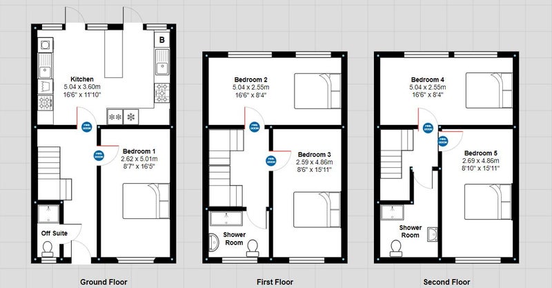 - 3 shower rooms, one per floor.