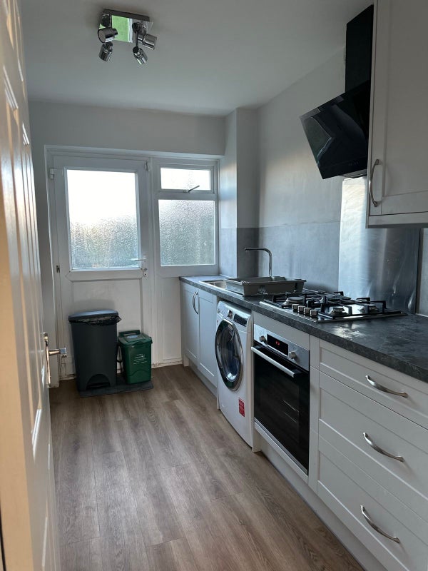 • Modern kitchen with fridge, oven, washing machine and appliances
