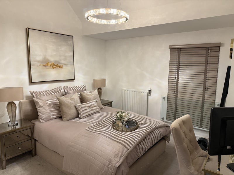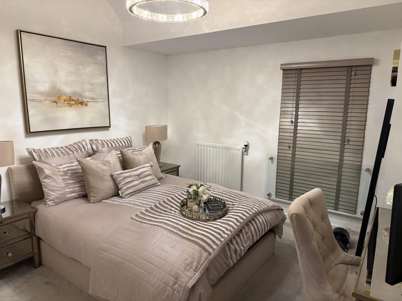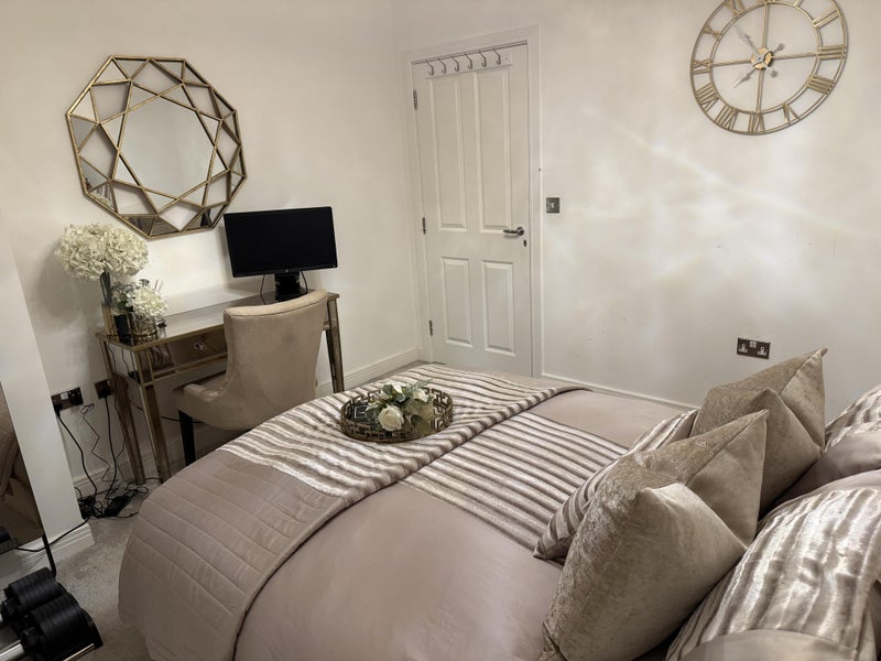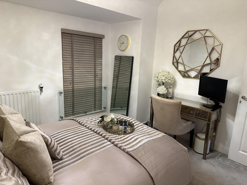 A beautifully presented, spacious double bedroom is available in a tastefully decorated 4-bedroom house in the popular sought after residential area in Chelmsford (Channels) . The room is fully furnished and finished to a high standard, featuring a comfortable double bed, stylish bedside tables, elegant lighting, fitted blinds, and a dressing/desk area, perfect for studying.