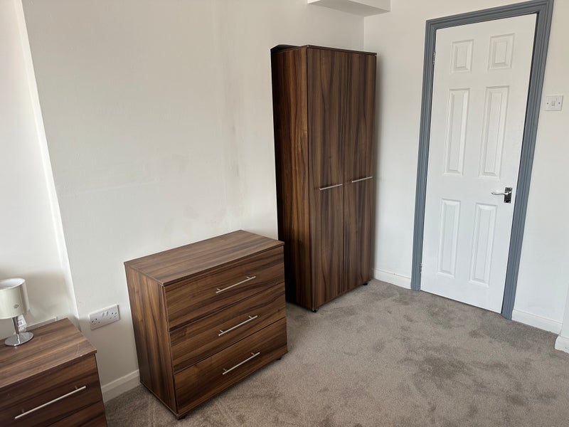Modern double bed with luxury headboard with storage , carpets and all furnishings are completely new .