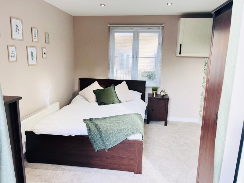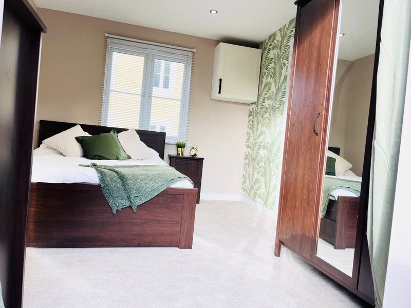 🌟 Smart clean room that comes fully furnished with matching furniture - DOUBLE BED with LARGE storage drawers under bed & comfortable MATTRESS with NEW mattress protector, TRIPLE WARDROBE with rail, shelf & long length mirror, LARGE chest of DRAWERS, NEW desk & chair, TV, bedroom door key, french doors leading out to garden (so your own private entrance). Quiet room at the back of the house with no other rooms next to it.