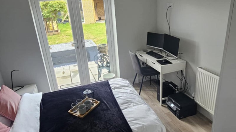 ✨ Ground-Floor Double Room with Balcony Doors & Garden View (£750) – Bright and airy, this expansive room features balcony doors opening onto the garden, offering tranquillity and natural light. Includes a wardrobe and full-length mirror for convenience.