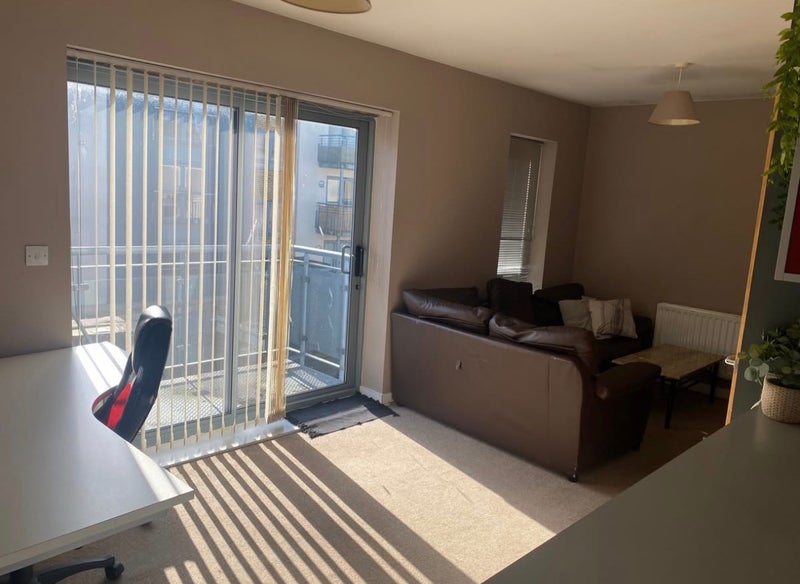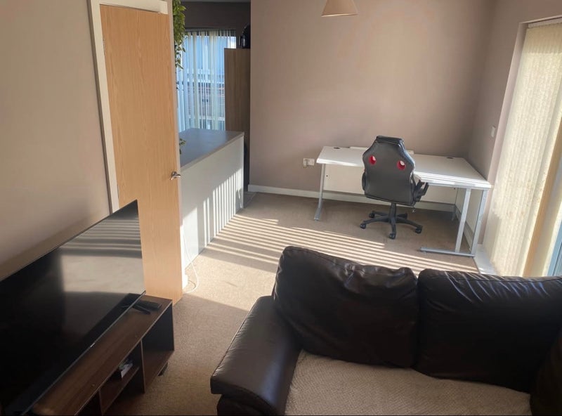 Bright and airy lounge/study area with storage cupboard Double-glazed patio doors leading to a private balcony