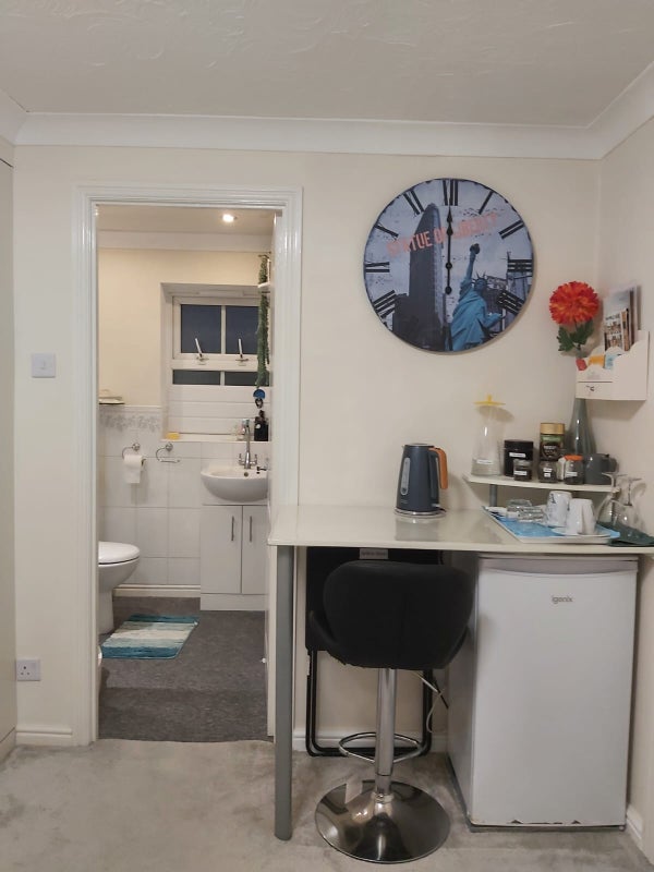 Double room with en-suite accessed from the hallway in a 3 Bed modern detached house, and newly decorated. New double bed and mattress, room with wardrobe, computer desk and bedside cabinets. Room has fridge, microwave, kettle and 32" TV with Netflix.