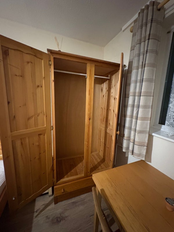 The room is fully furnished with bed, wardrobe, chest of draws and a fridge/freezer.