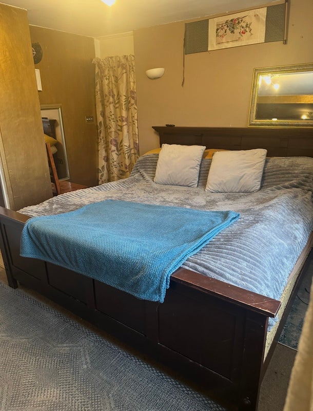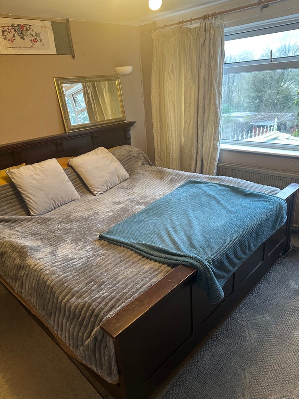 The room is fully furnished with an emperor size bed and huge amount of storage. There is a 75” TV in the room.