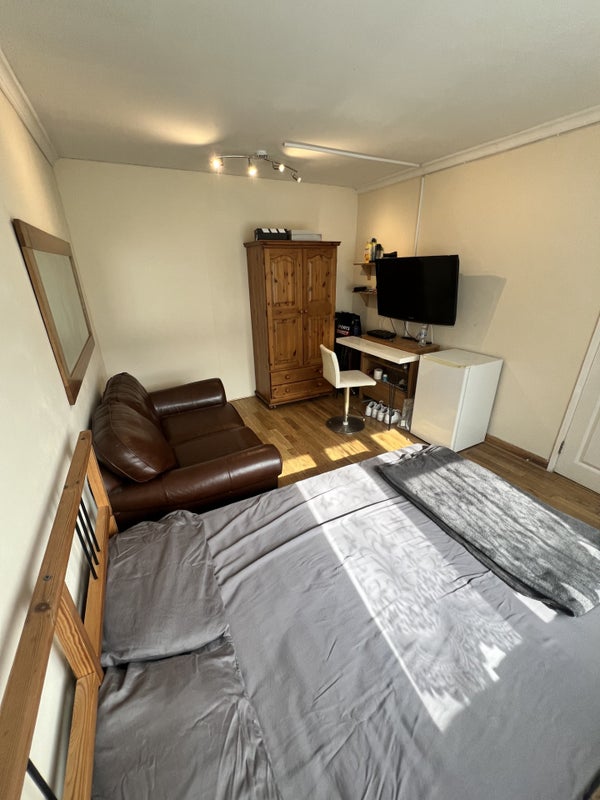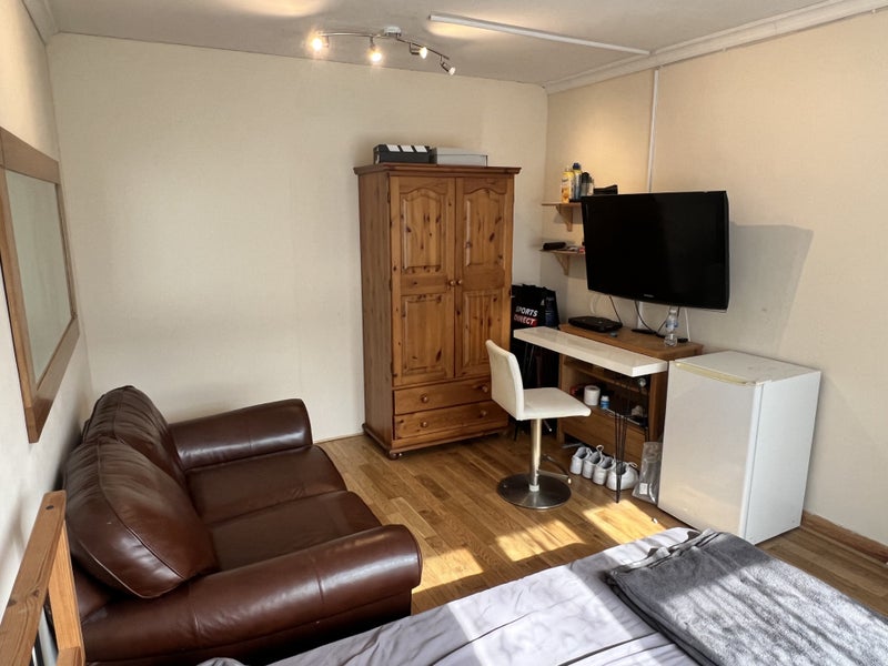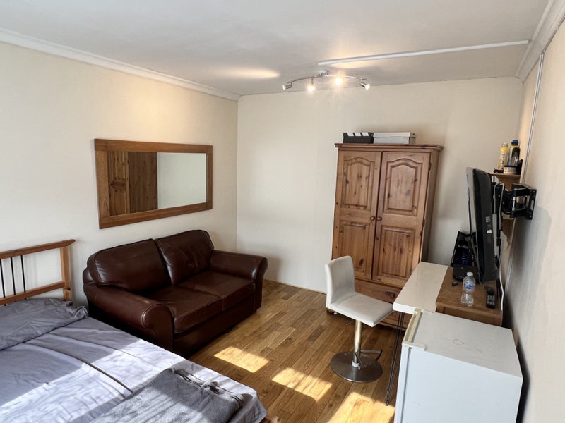 This is a large comfortable room, approximately 4.6m x 3.2m, fully furnished with double bed, wardrobe, sofa, chest of drawers, Sky TV. Fridge included in the room.