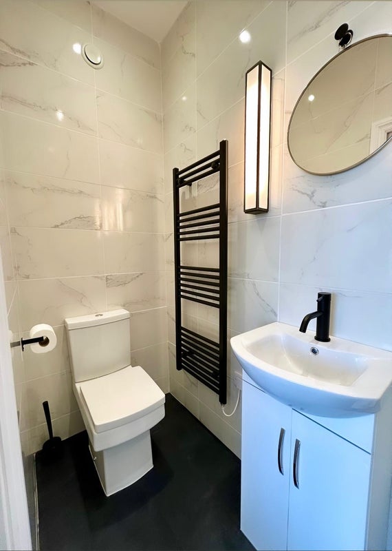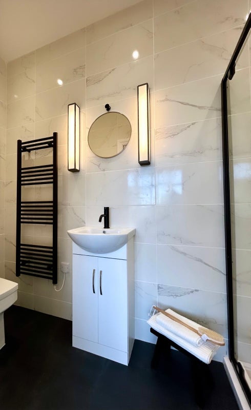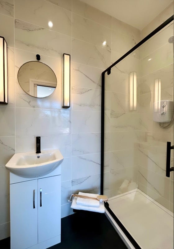 The brand-new bathroom suite boasts an electric shower, wall mirror, sink, toilet, and ambient lighting.