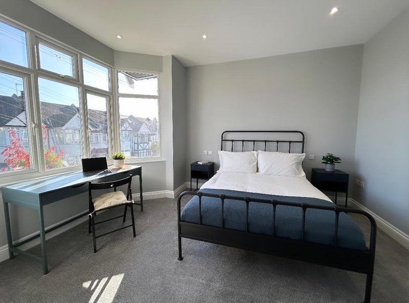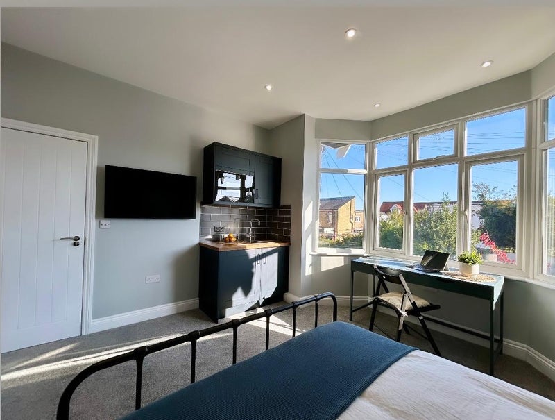 The room boasts high ceilings, a king-size bed & mattress, beside tables, a beautiful big bright bay window with blinds, and fitted mirrored wardrobes. There is also a workspace desk with storage, a wall-mounted flatscreen smart TV, and views facing out to the tree-lined street.