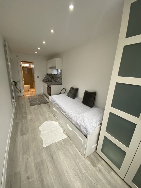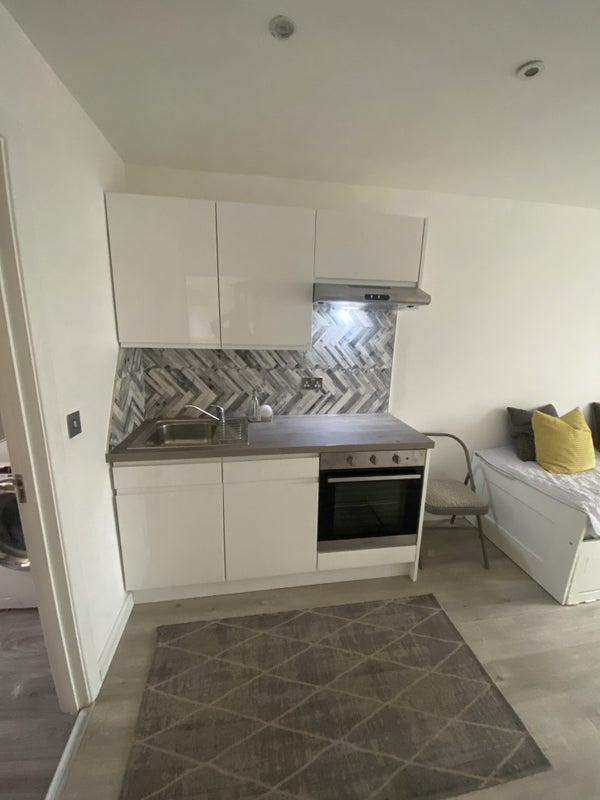 Studio in Loughton ideal for one person, kitchen, conventional oven, induction hob, single guest IKEA bed, opens into double with two drawers, wardrobe, central heating, fridge freezer, spacious bathroom, washer/dryer, excellent for a single person, very clean and modern. 12 mins walk from Debden station, 3 mins walk from E15 acting school in Loughton. No pets allowed.