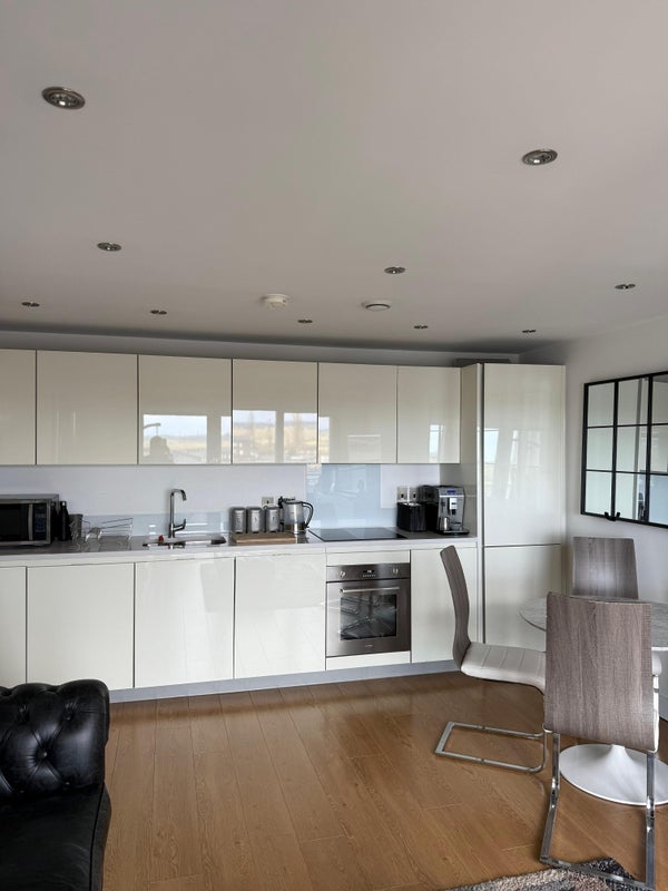 The kitchen is fully equipped, including a coffee machine, modern appliances, and ample storage. Both bedrooms are generously sized, and the apartment is finished to a high standard throughout.