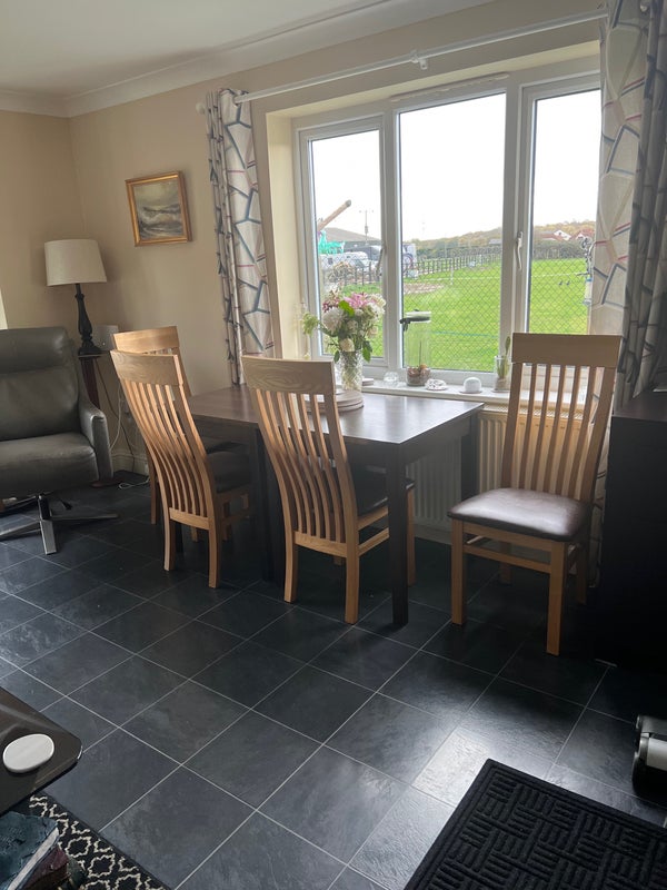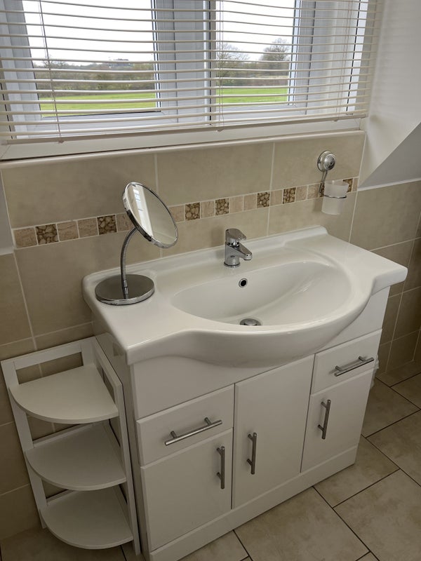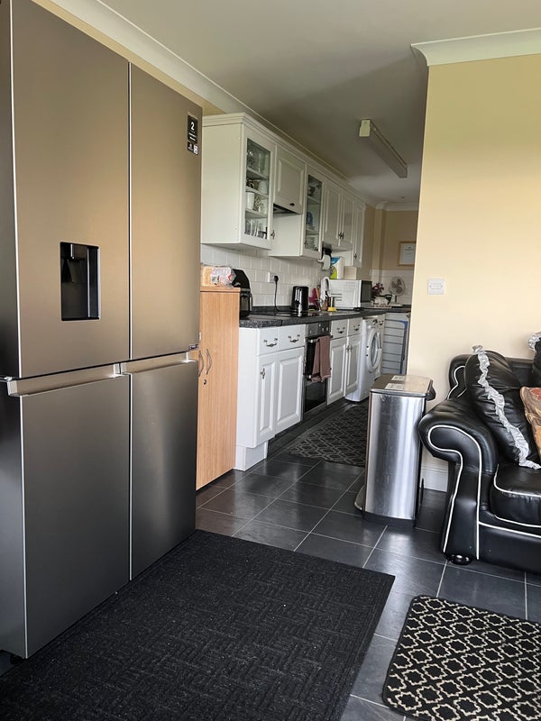 The kitchen is fully equipped with American fridge freezer. This is shared but shelves are allocated in each. There is a double oven, hob, air fryer, microwave, toaster, washing machine. All utensils saucepans and crockery and cutlery are supplied. There is a pretty patio with outside table and chairs looking across the paddocks. and use of washing line.
