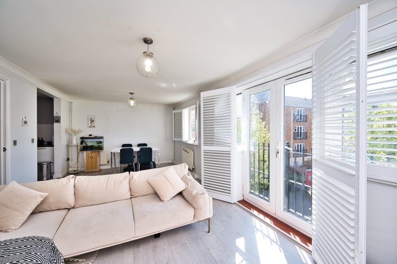 The property boasts a bright and spacious reception room (over 24ft in length), ideal for both relaxing and dining, with doors opening to a charming Juliet balcony providing excellent natural light and partial views towards the River Thames. The living space flows into a semi open-plan kitchen, well laid out and fully equipped, making it perfect for modern lifestyles and entertaining.