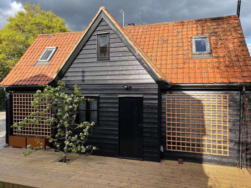 A well-designed, timber-clad annexe set within the grounds of a private home, offering a calm and fully furnished space with its own decked terrace.