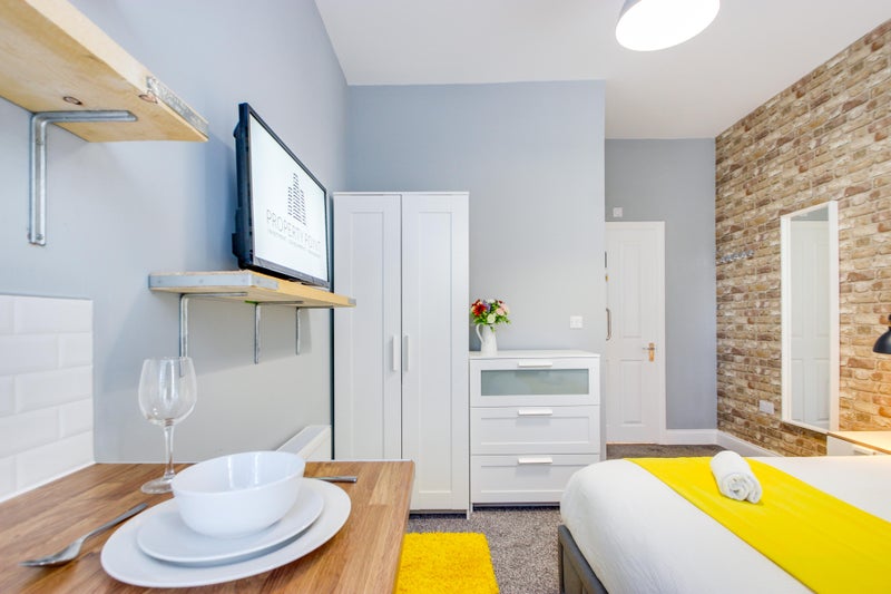 The rooms are furnished with a double bed, wardrobe, chest of drawers, bedside table and a TV.