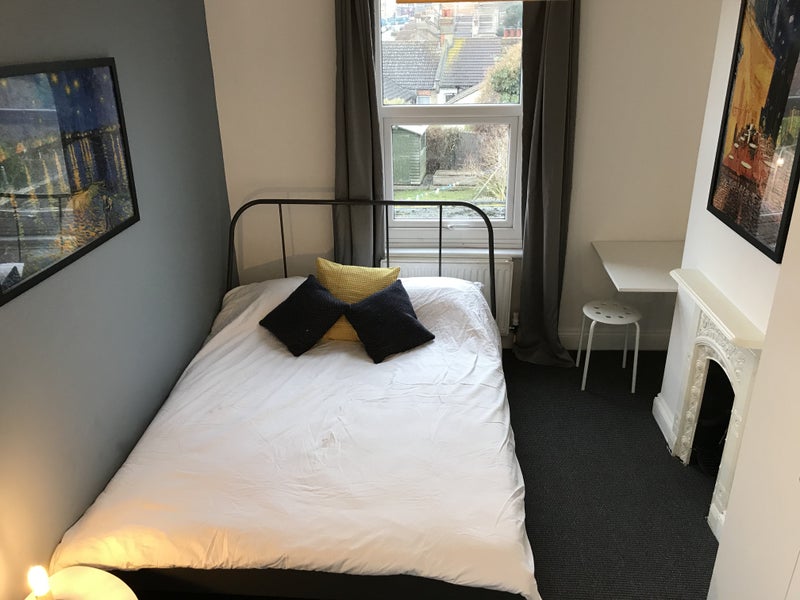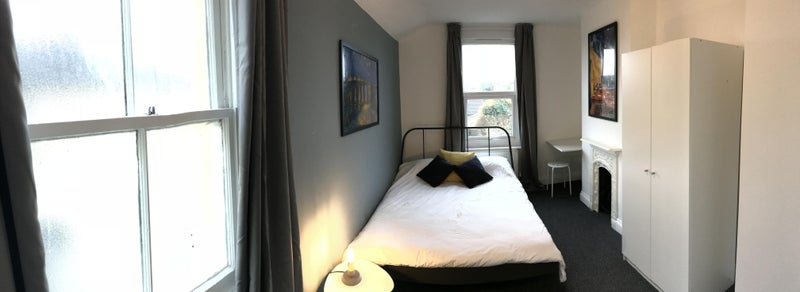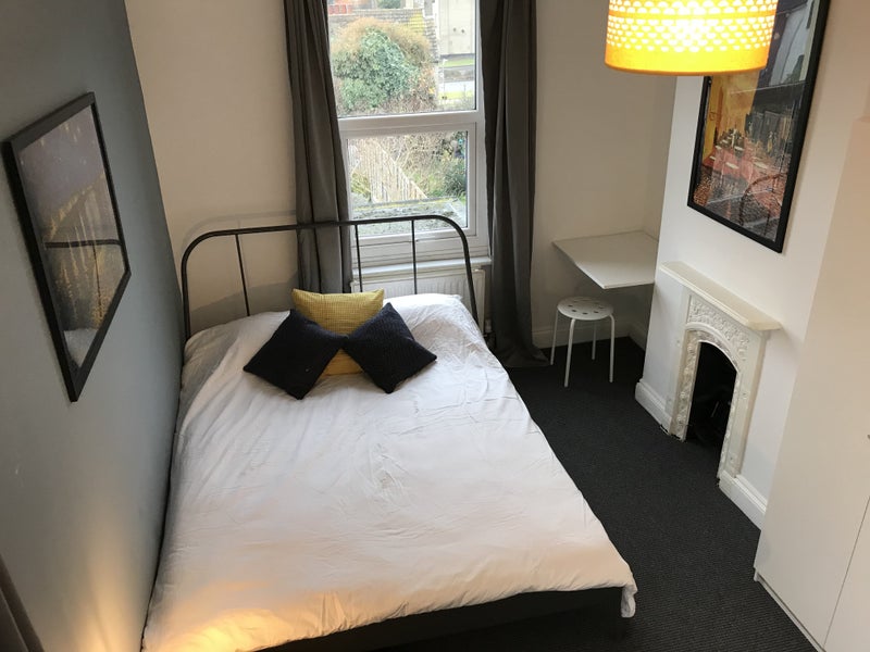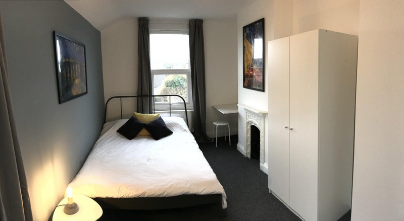 The Double Room: The room is situated on the first floor. The room is furnished with a double bed and mattress, bedside table and side light, wardrobe, wall mounted desk and stool, tasteful artwork and blackout curtains. The room shares two communal bathrooms with 3 other housemates, so 1 bathroom between 2 housemates. .