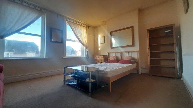 Room 1. Size 5.5m x 4m. Large 1st floor front furnished room with sofa, wardrobe ,chest of drawers, TV stand and book shelf