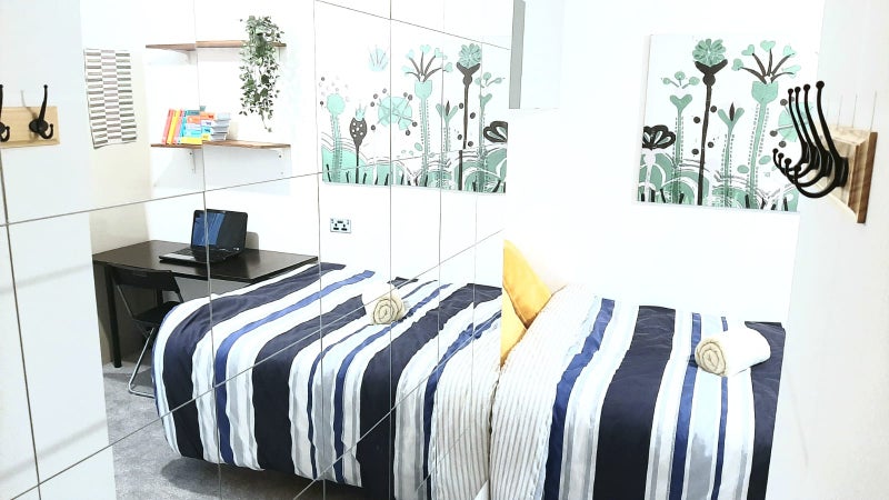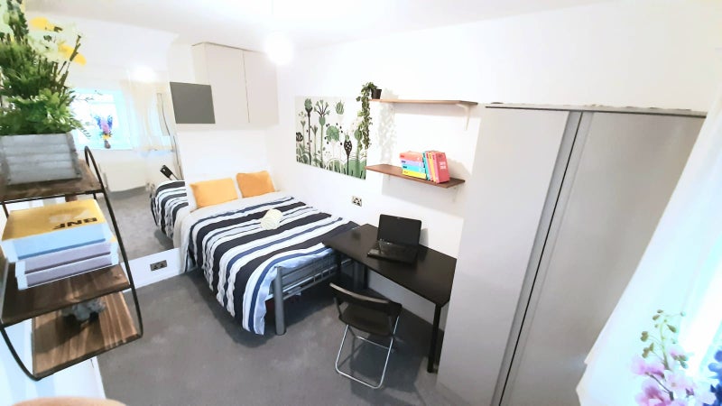 All rooms are furnished with storage unit(s), a desk, a chair, a bed, mattress, mattress protector and bed sheet. Duvet, pillows/cushions, books and plants are *not* provided and are shown in pictures for demonstration purposes (they can be purchased from Tesco if necessary, which is only 5 min walk away).