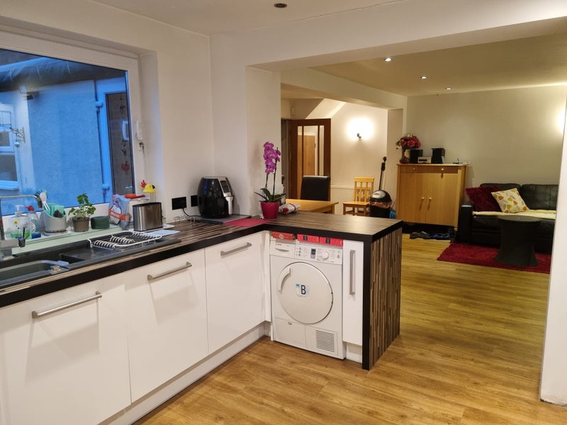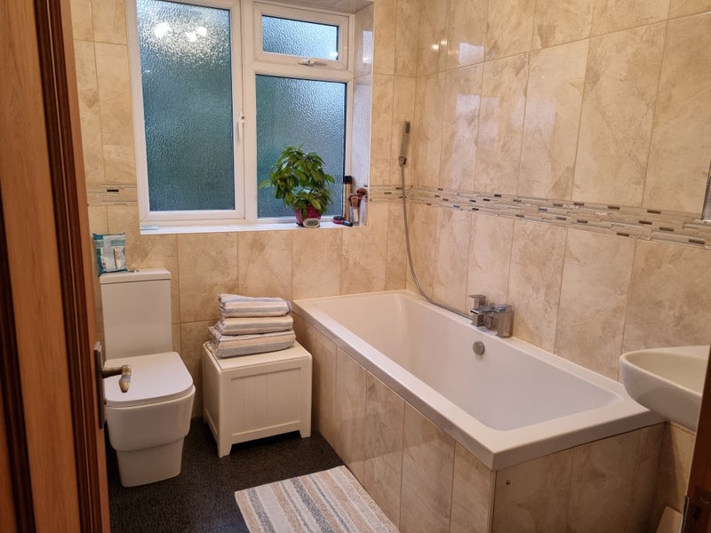 Large airy double room with triple wardrobe available in large property with 2 lounges, 2 bathrooms (1 with shower and 1 with bath), garden and off road parking. Central location, 5 mins walk to train station and 1 min to high street. Includes all bills including broadband. We can have separate lounges, both with TV's. Suit working person. Sorry no couples or pets.