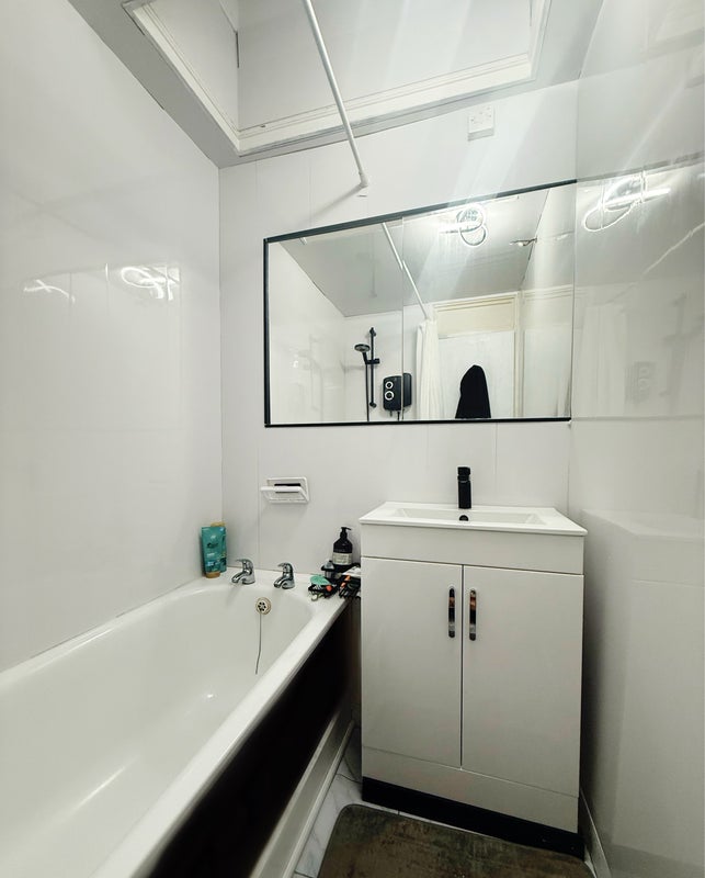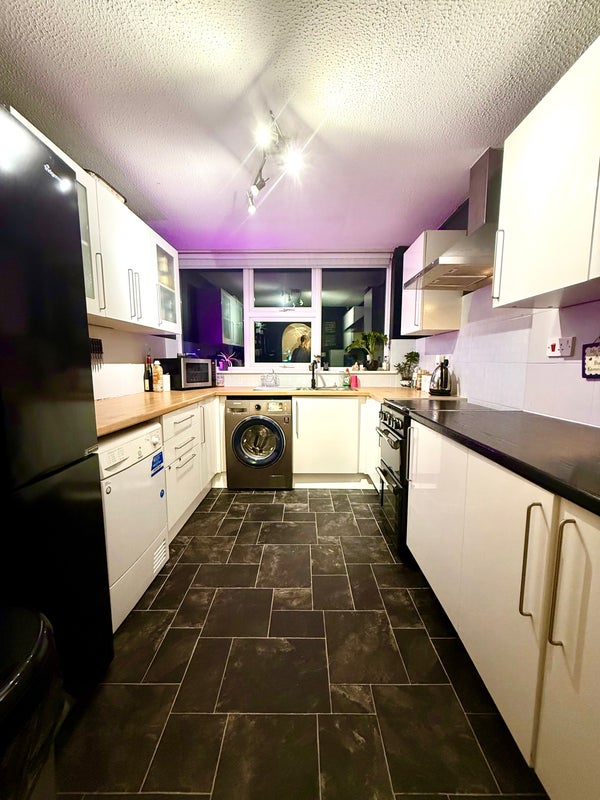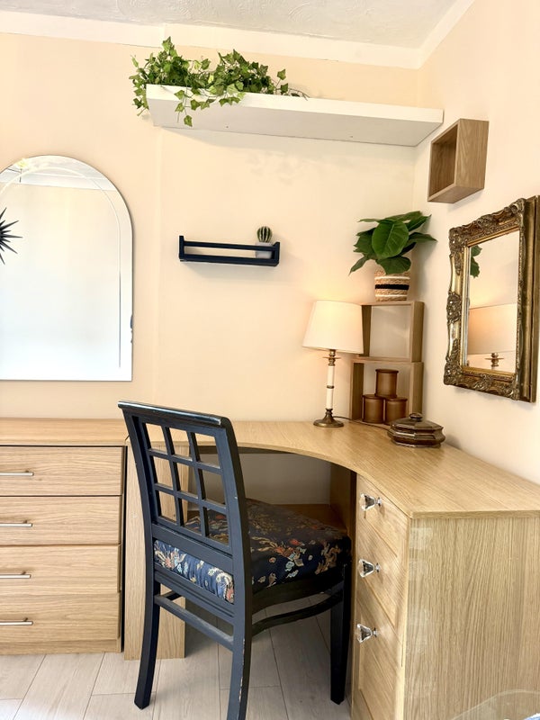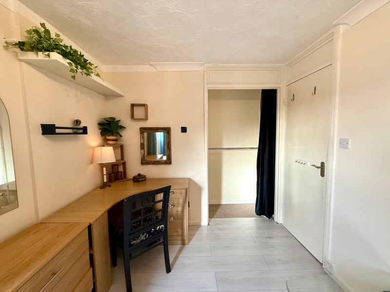 It comes fully furnished with a double bed, 2 chests of drawers, bedside cabinet, desk, chair, large built in wardrobe lamp, kettle etc
