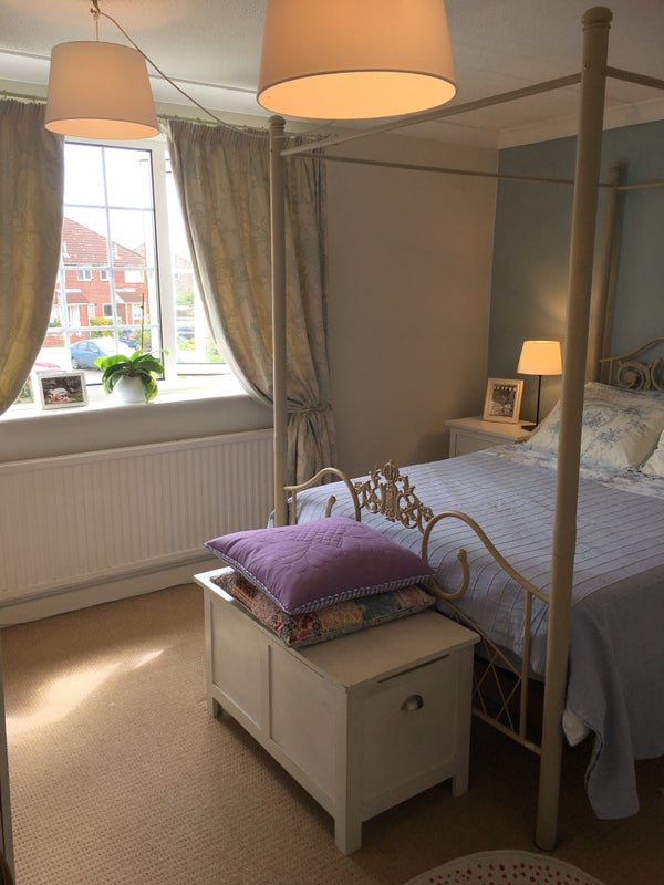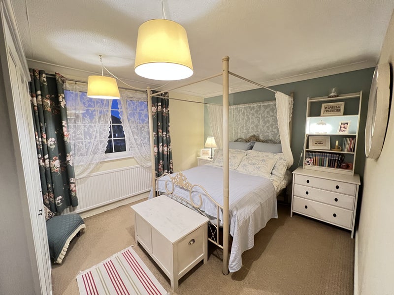 Spacious double bedroom (former master bedroom) in 5 bed detached house. Furnished with a four poster double bed, bedside table, tall boy, triple wardrobe, a chest of draws, a bookcase, a large mirror and an armchair. A desk and chair are available in the separate study.