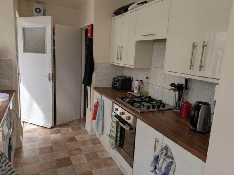 The house has 2 bathrooms, a living room with TV, shared kitchen with all the appliances, and a back garden.