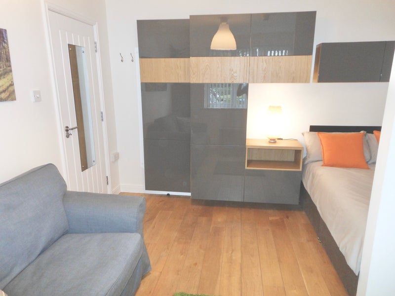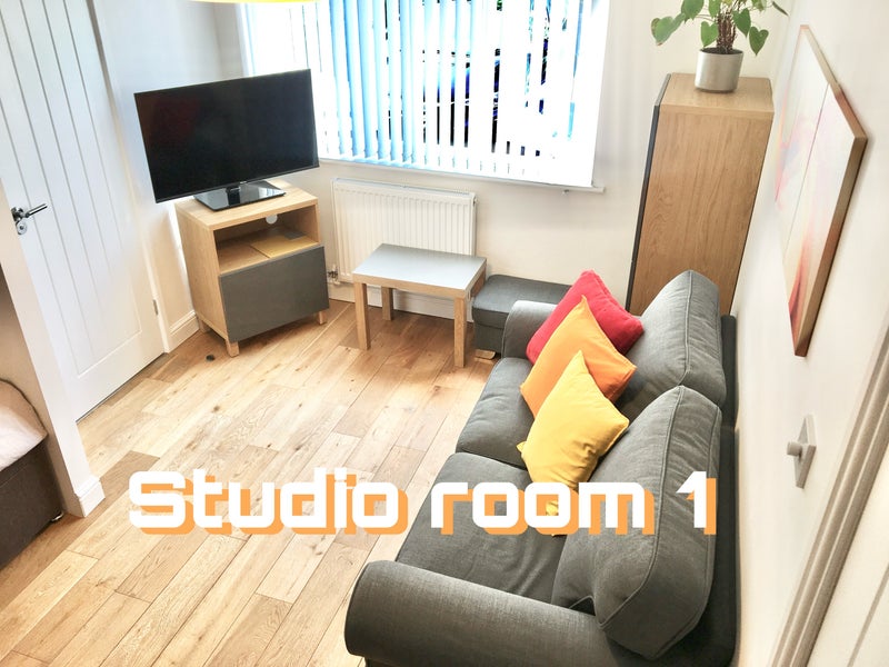 🟡 Studio room 1 is a large fully furnished room including your own private living room with its own sofa , foot stool, lounge furniture, Long mirror, lamp, Smart tv, Dimmable lighting, Desk/table and chair stored out of sight.