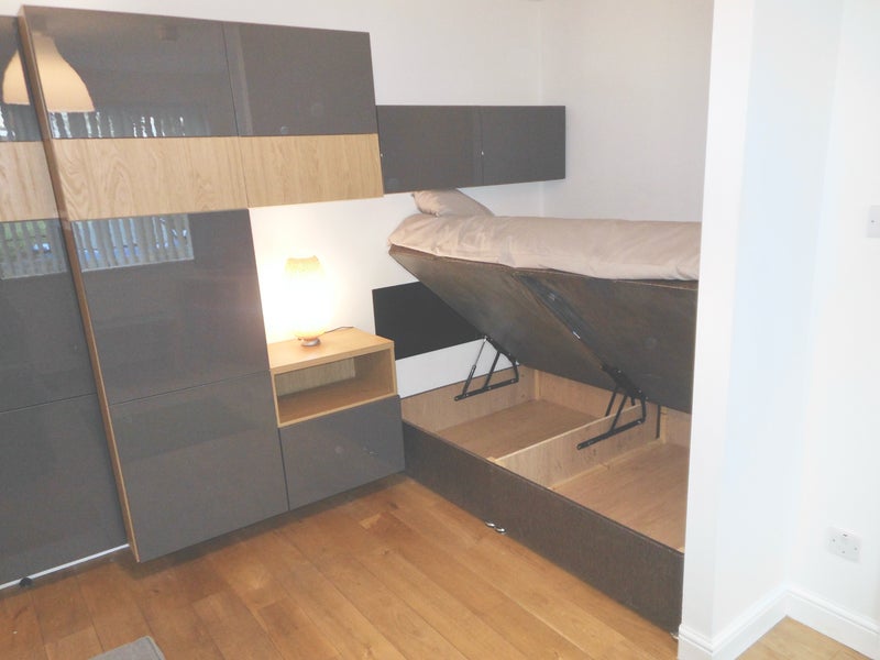 Your bedroom area has lots of storage, A double bed that easily lifts up to reveal a large storage area (see photo) with a great mattress, and wardrobe. The en-suite has a powerful shower with plenty of hot water, Toilet, wash basin, electricity heated towel rail and air extraction fan.