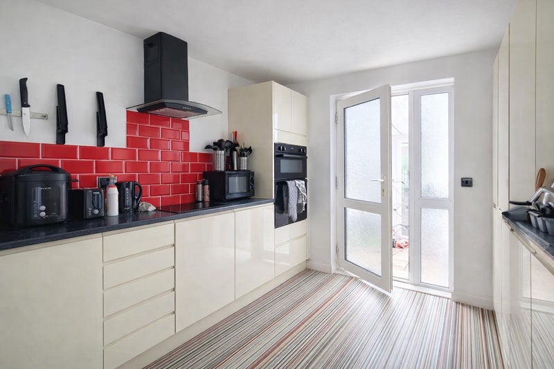 The modern good-sized kitchen has all necessary appliances including a double oven, microwave, large fridge freezer, washing machine, and plenty of cupboard space. It has the added bonus of a dishwasher!