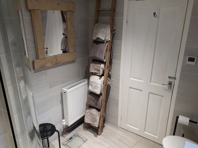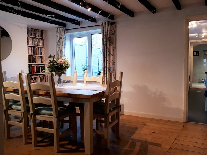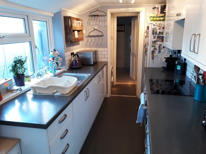 Downstairs the house has a living room, dining room with desk space under the stairs (available for use on Mondays and Thursdays), a galley kitchen and bathroom with shower.